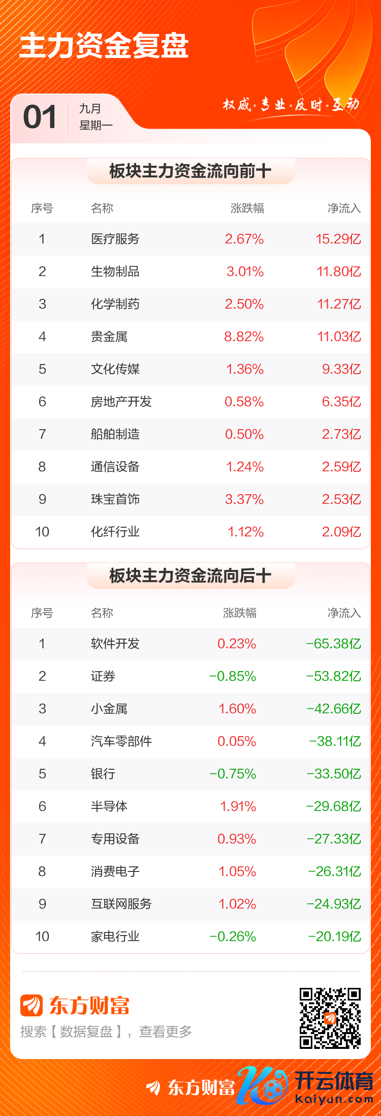 9月1日,滬指漲0.46%,深成指漲1.05%,創業板指漲2.29%。兩市成交額2.75萬億,較上個交昔日縮量483億。數據領略,本日大盤主力資金凈流出571.43億。醫療勞動、生物成品、化學制藥等板塊主力資金流入排行居前,其中醫療勞動凈流入15.29億元。